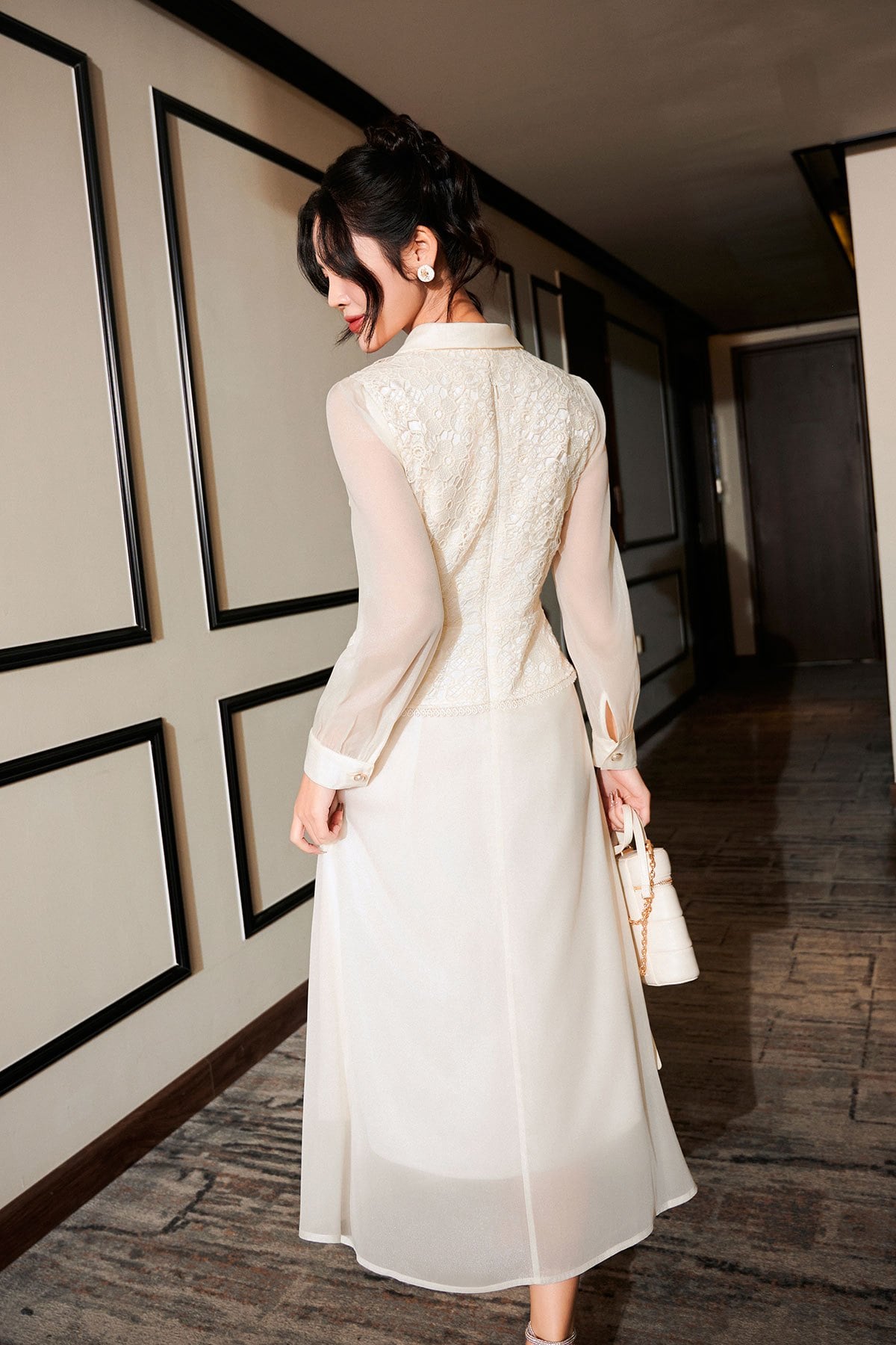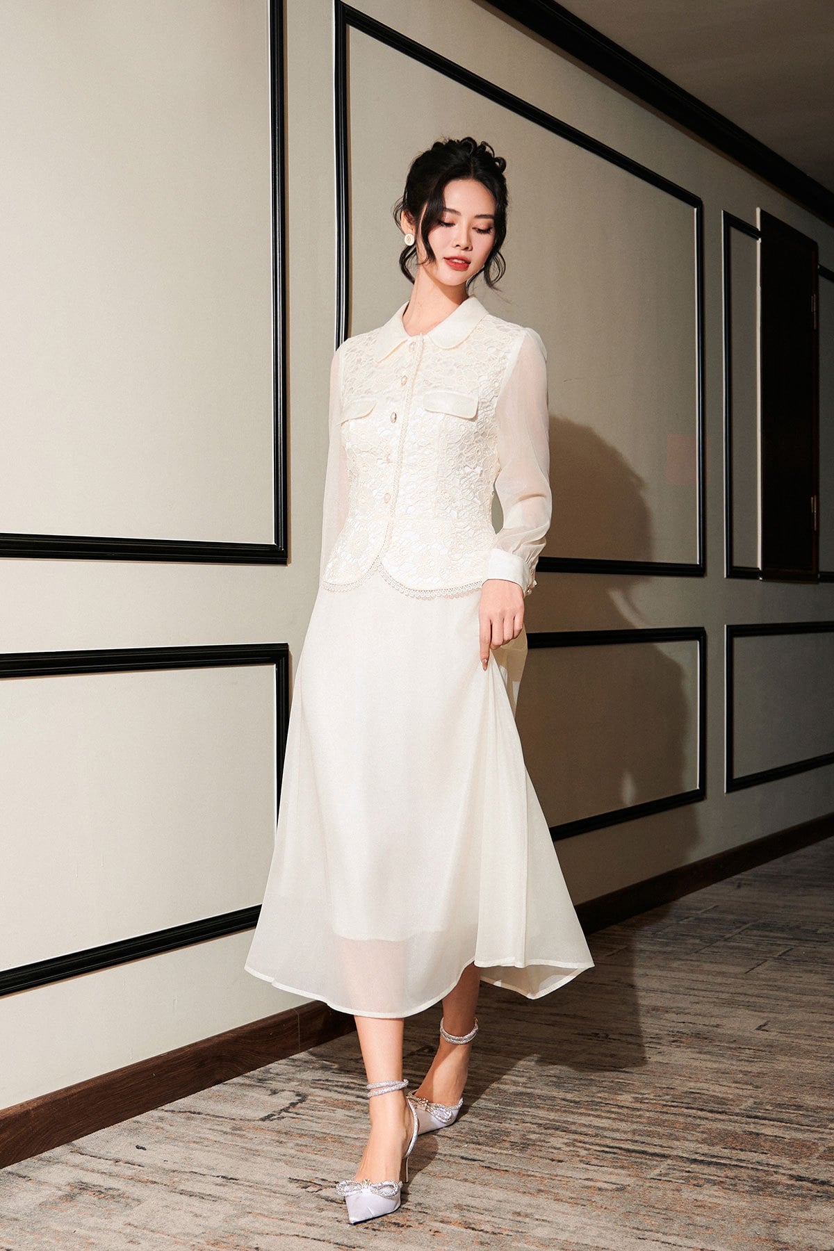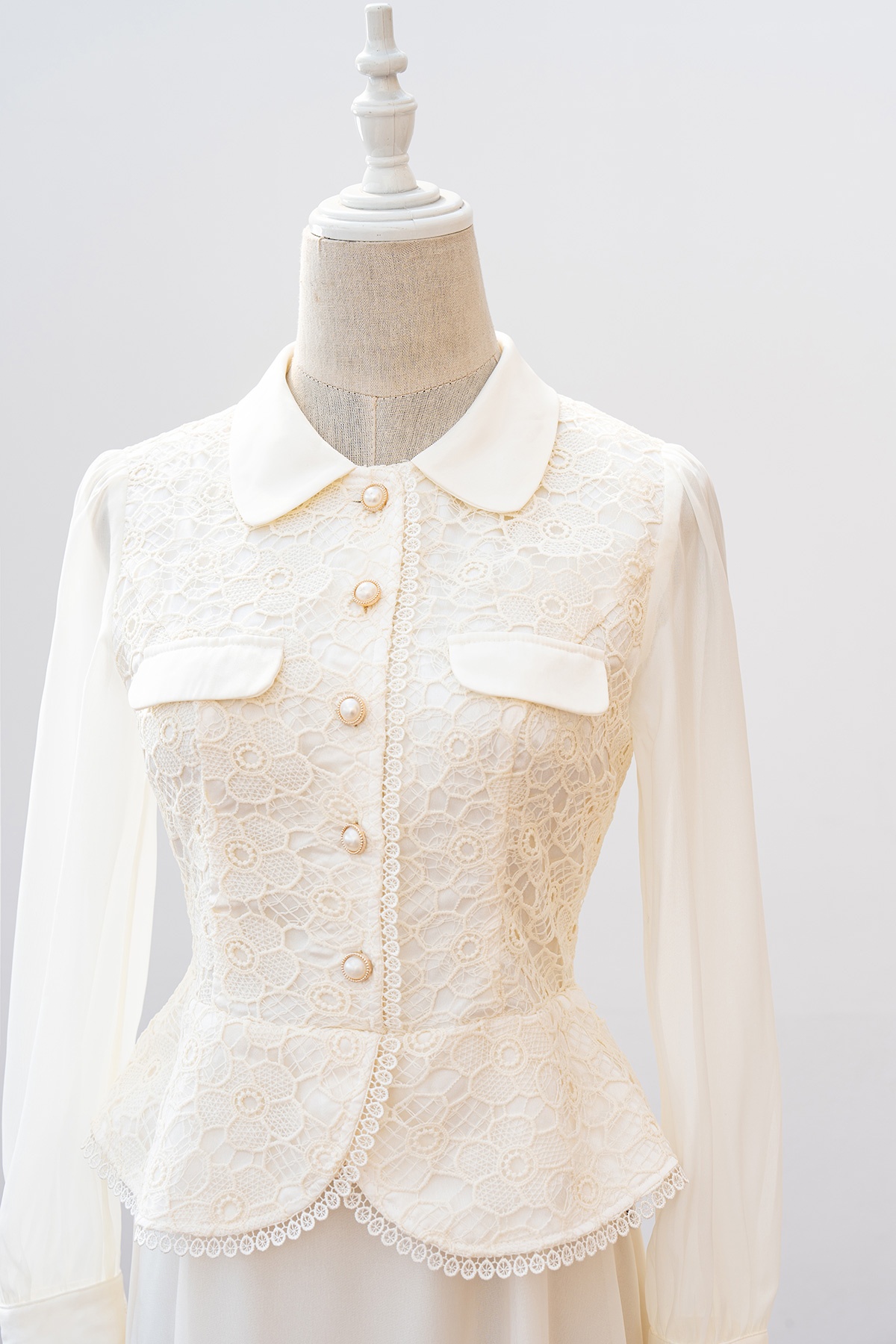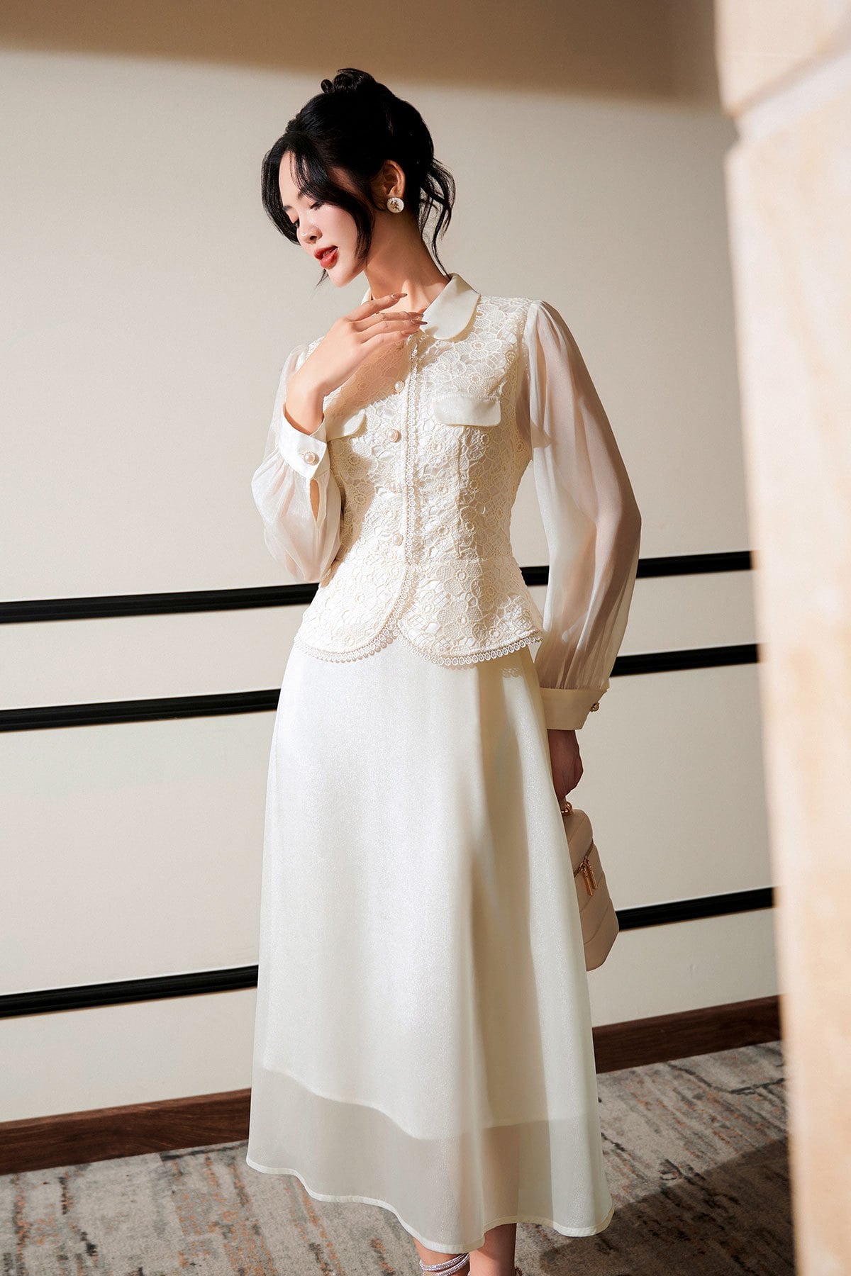 Mô tả sản phẩm : Dáng xòe, cổ sen phối, thân ren peplum, tay dài phối tơ óng, nẹp đính cúc, kéo khóa sau lưng