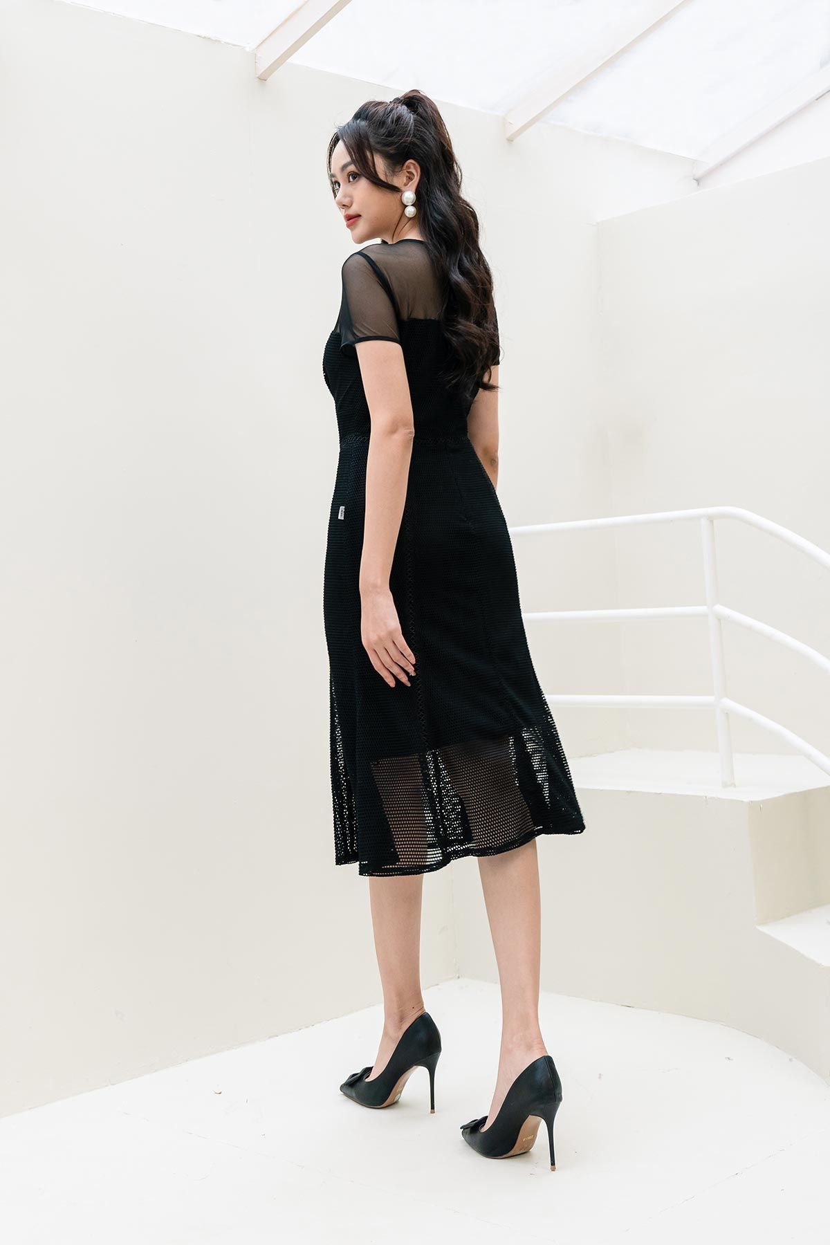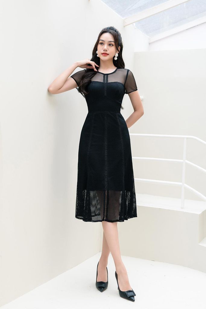Mô tả sản phẩm : Đầm dáng ôm A, thân lưới pha thêm ren,cổ tròn,tay cộc bằng vải thun lưới,kéo khóa giọt lệ sau