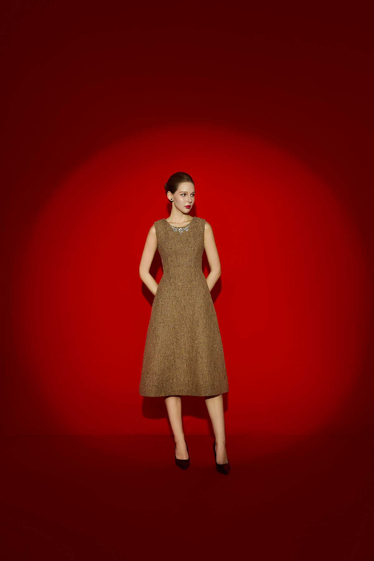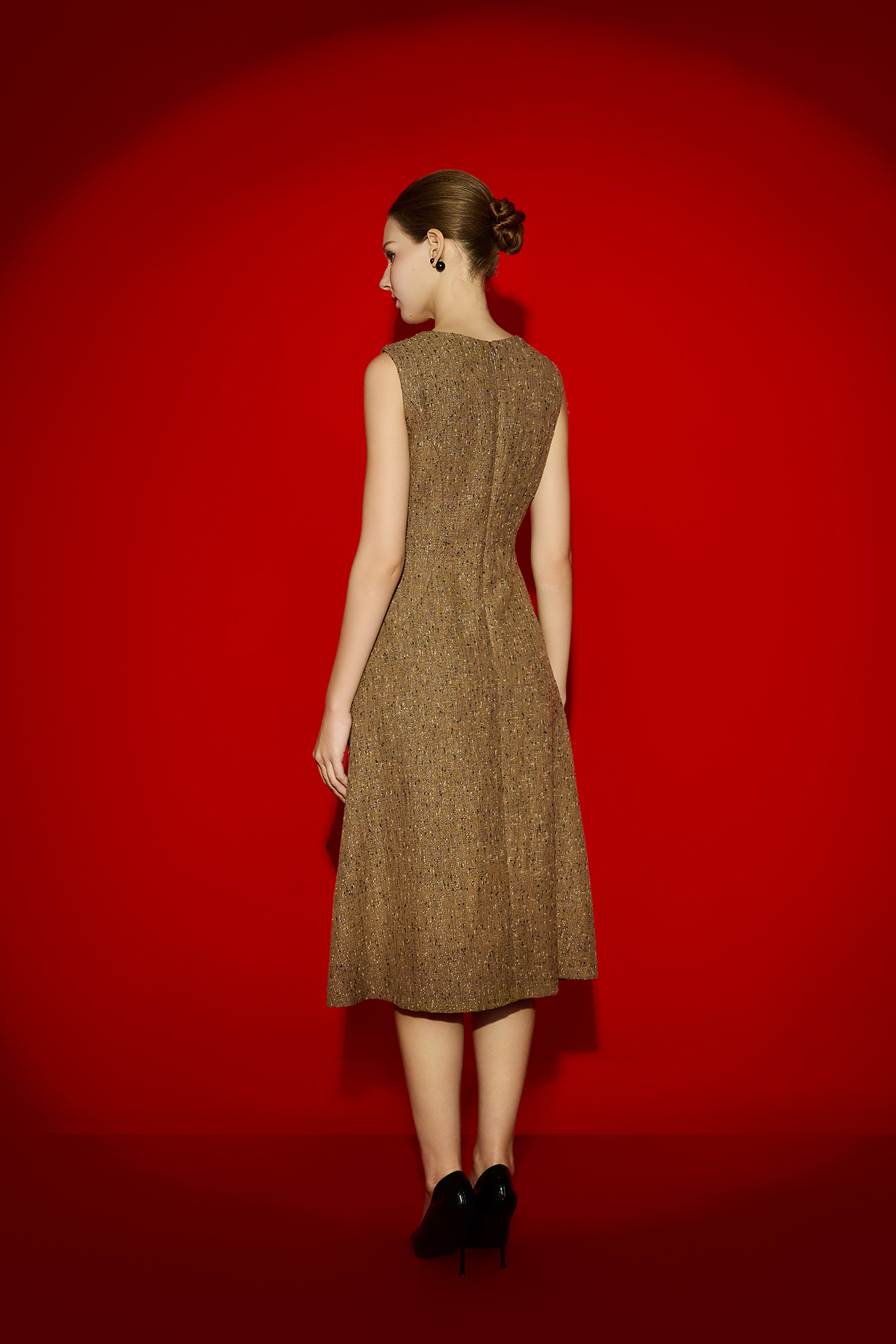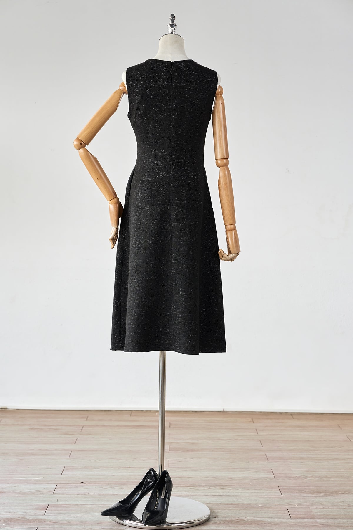 Mô tả sản phẩm : Đầm dáng xòe, cổ tròn đính dây trang trí cổ trước, thân bổ mảnh, khéo khóa sau.