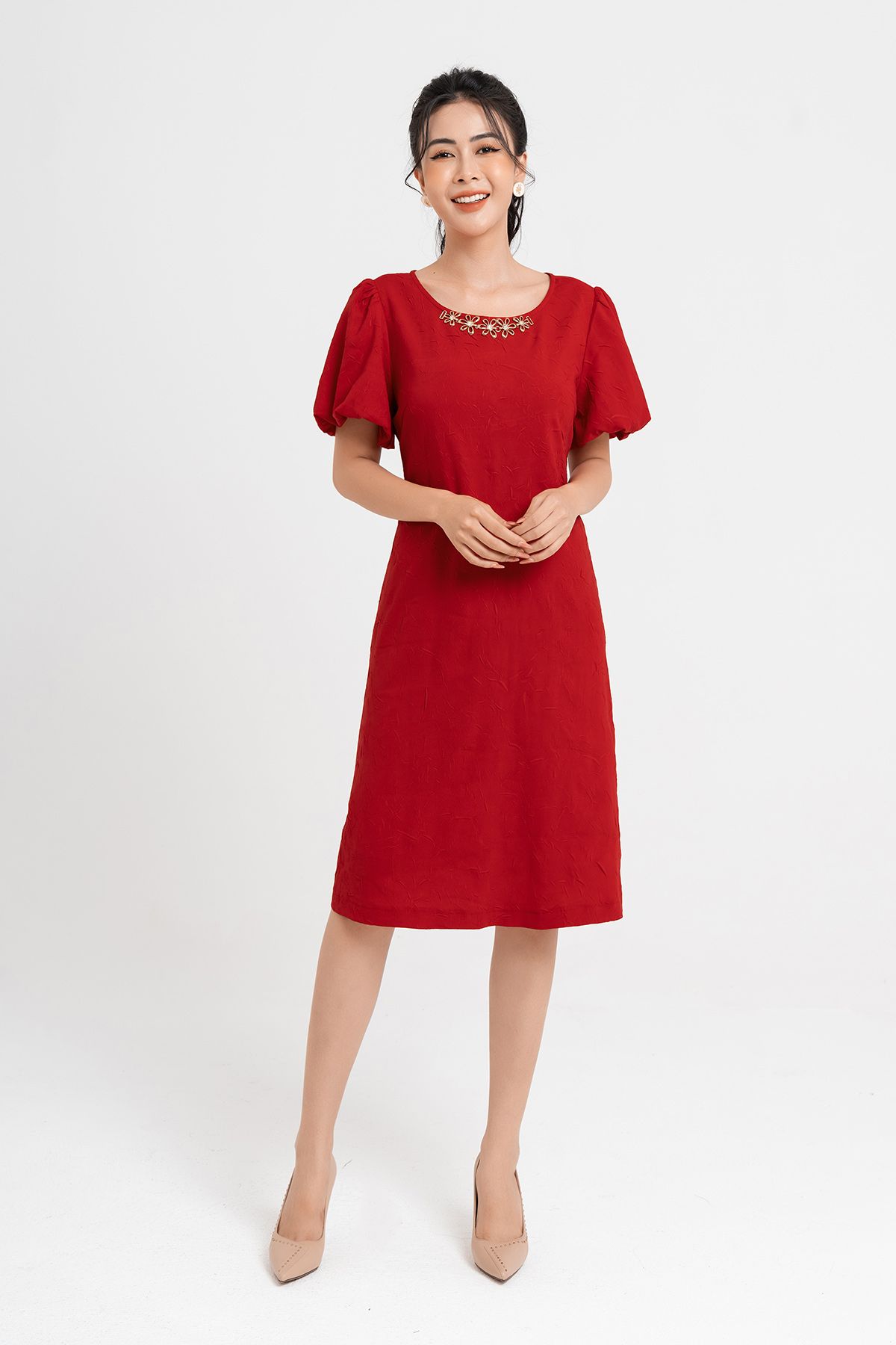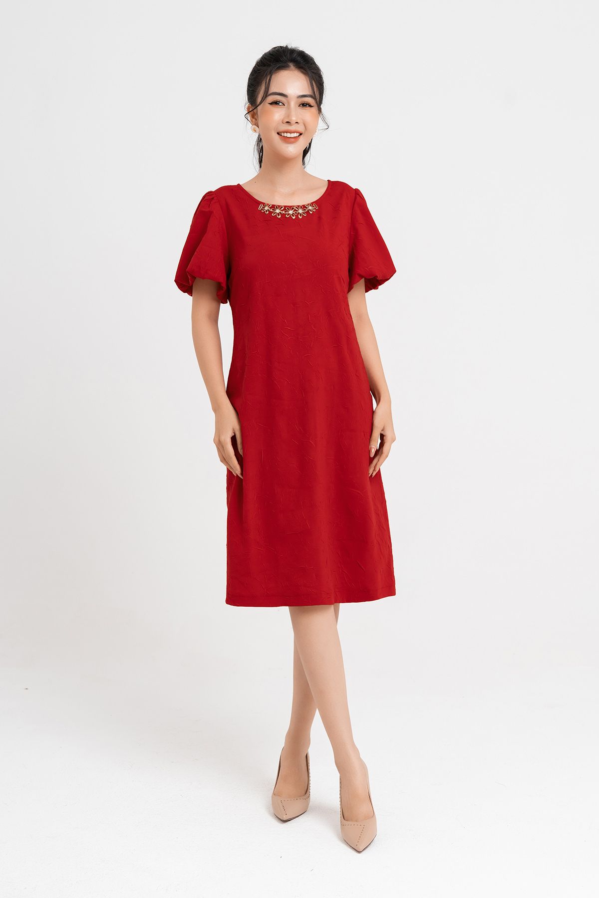 Mô tả sản phẩm : Dáng suông,kéo khóa sau lưng,cổ đính cườm trang trí,tay bồng 2 lớp