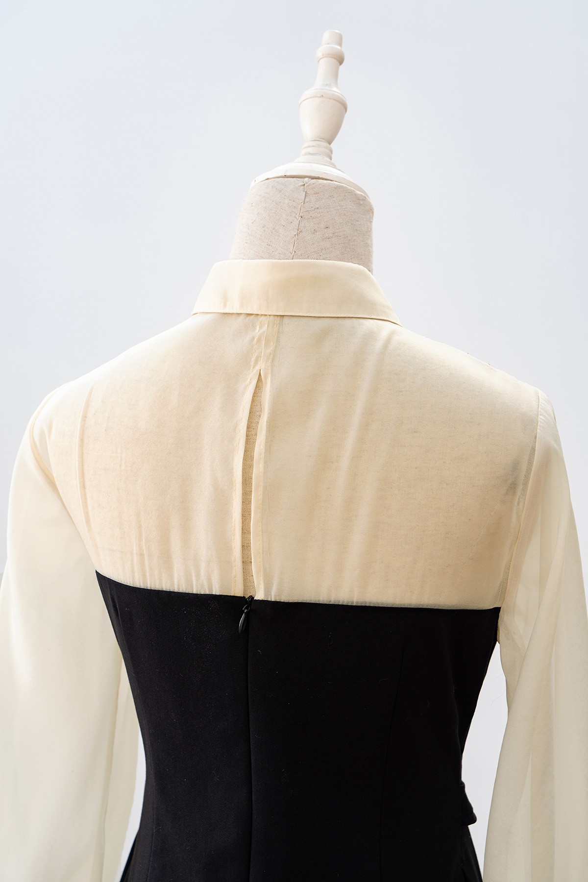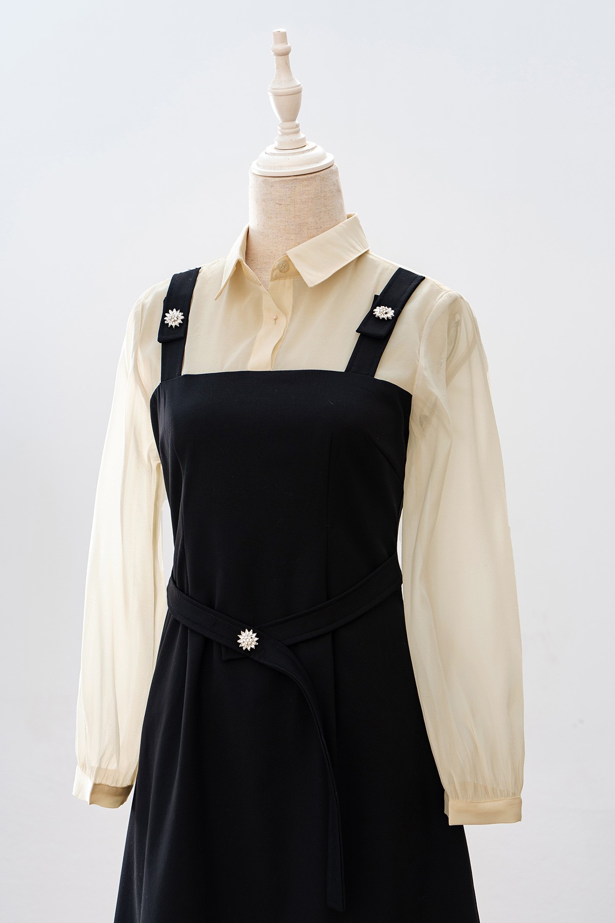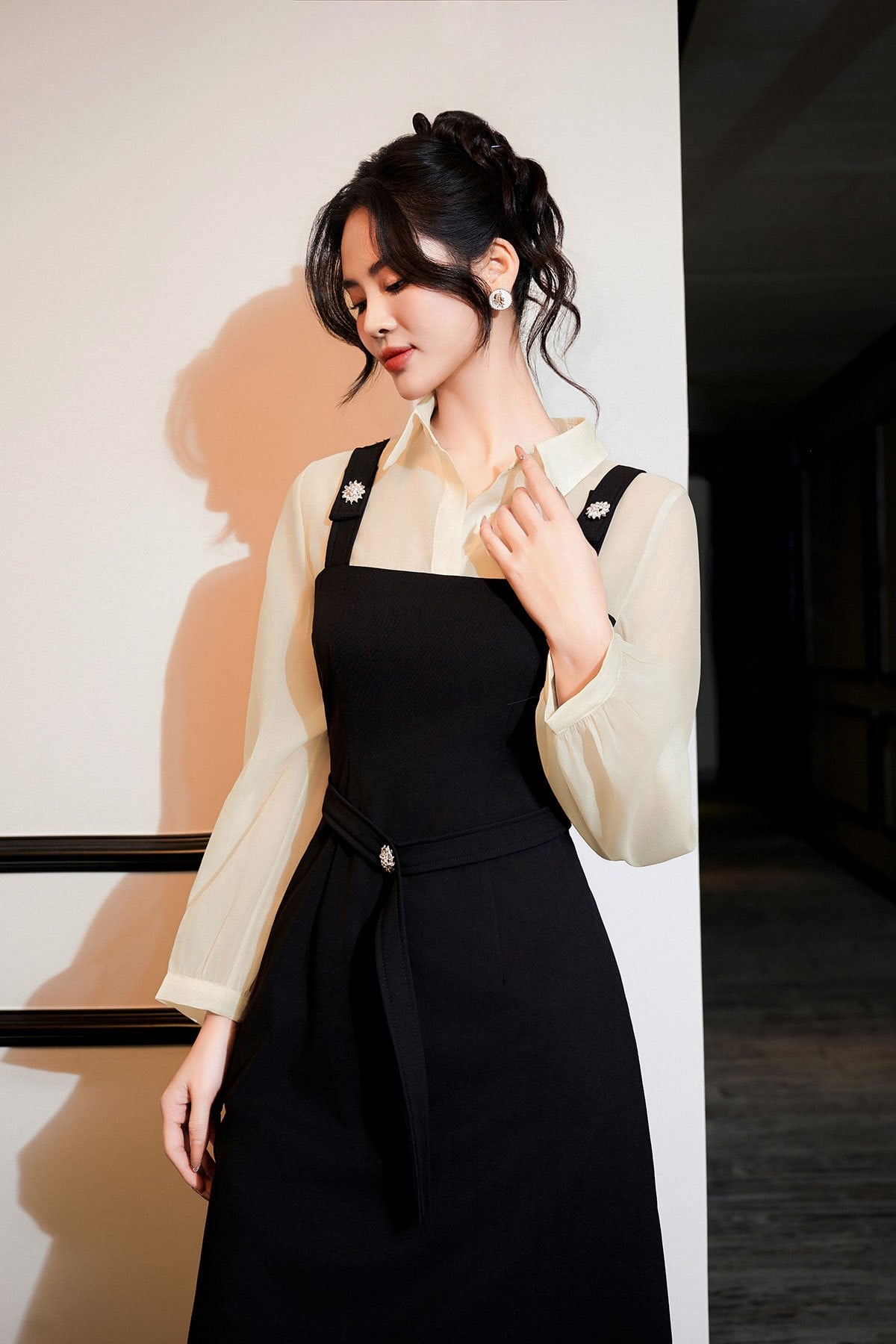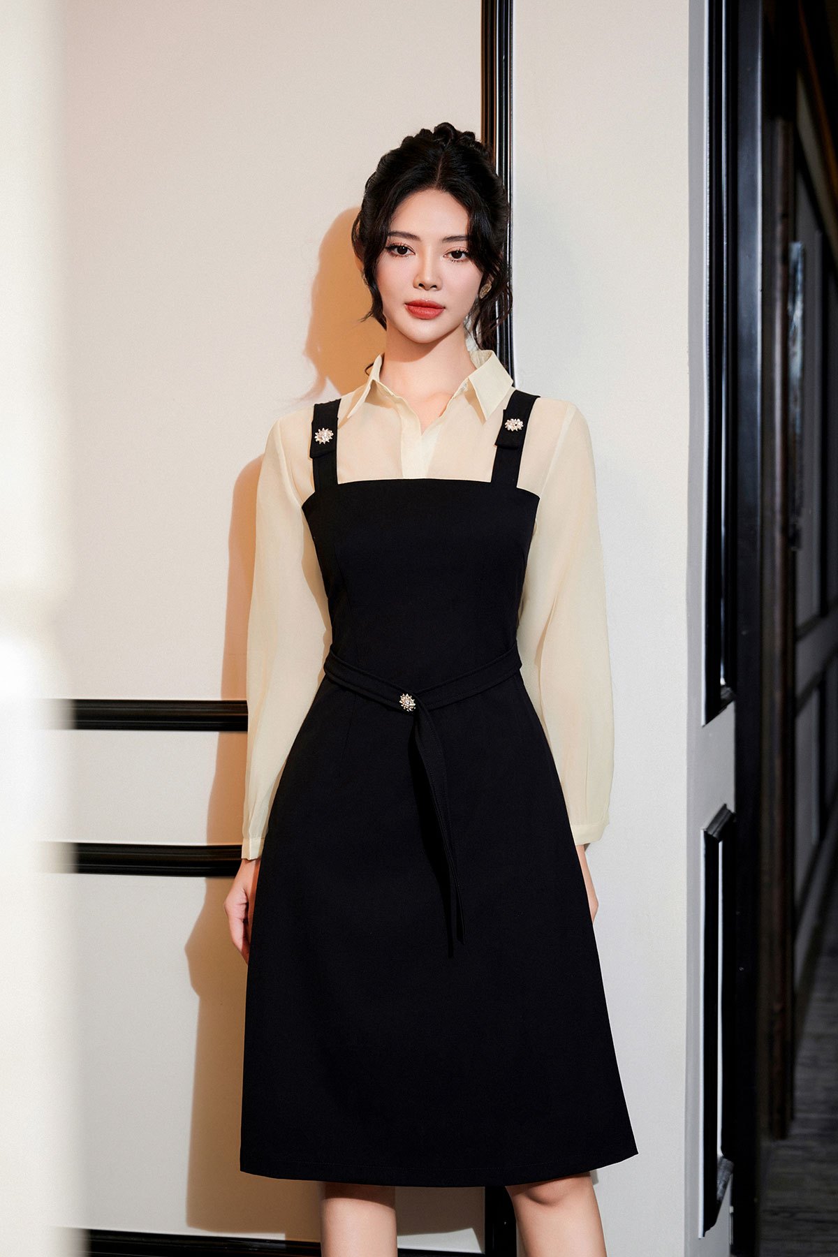 Mô tả sản phẩm : Đầm dáng A, dài qua gối, dài tay phối voan, đai liền đính cúc đá, kéo khóa sau lưng, cúc dự phòng được đính trong mác sử dụng của sản phẩm