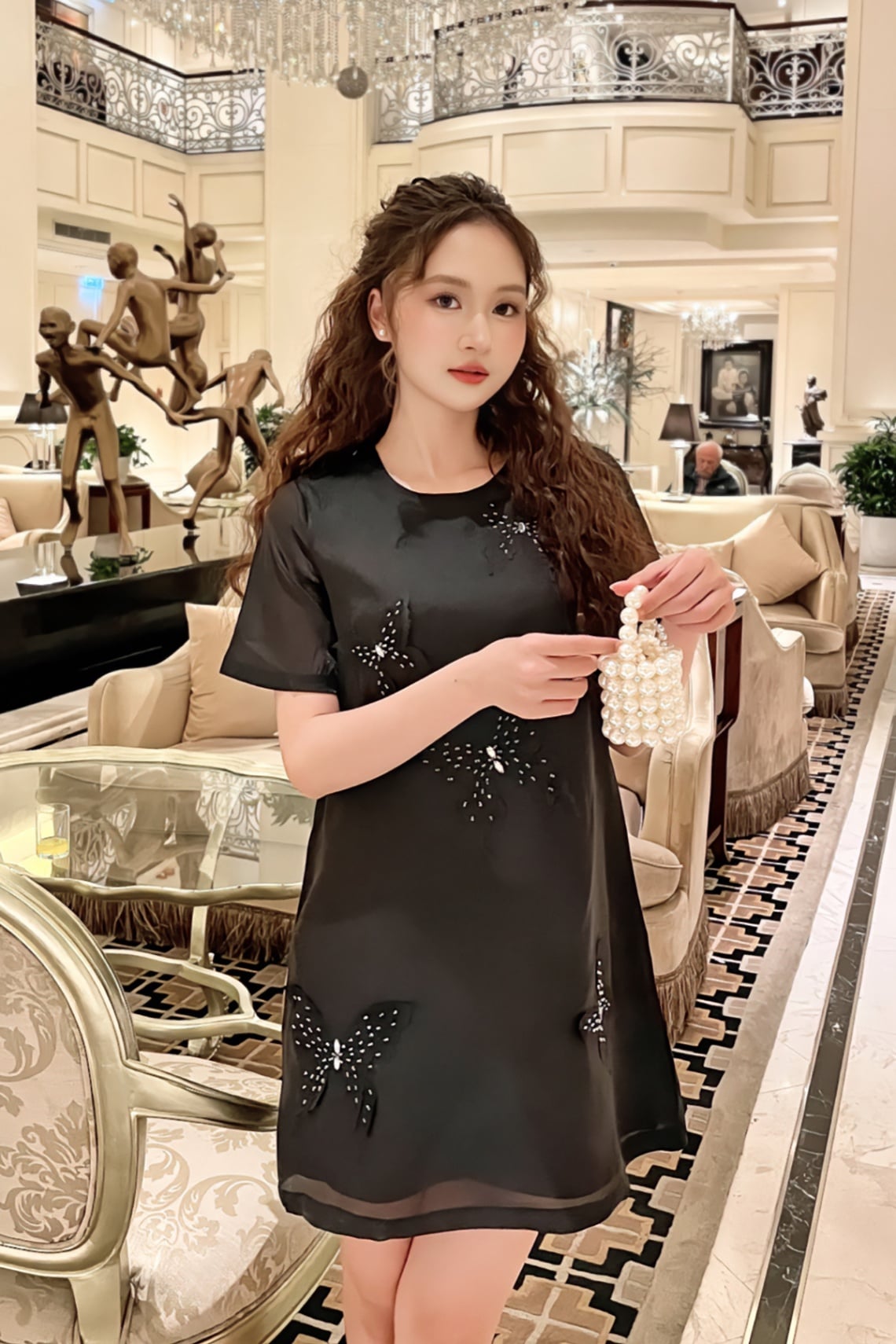Mô tả sản phẩm : Đầm dáng suông cổ tròn , tay ngắn , đính bướm nổi