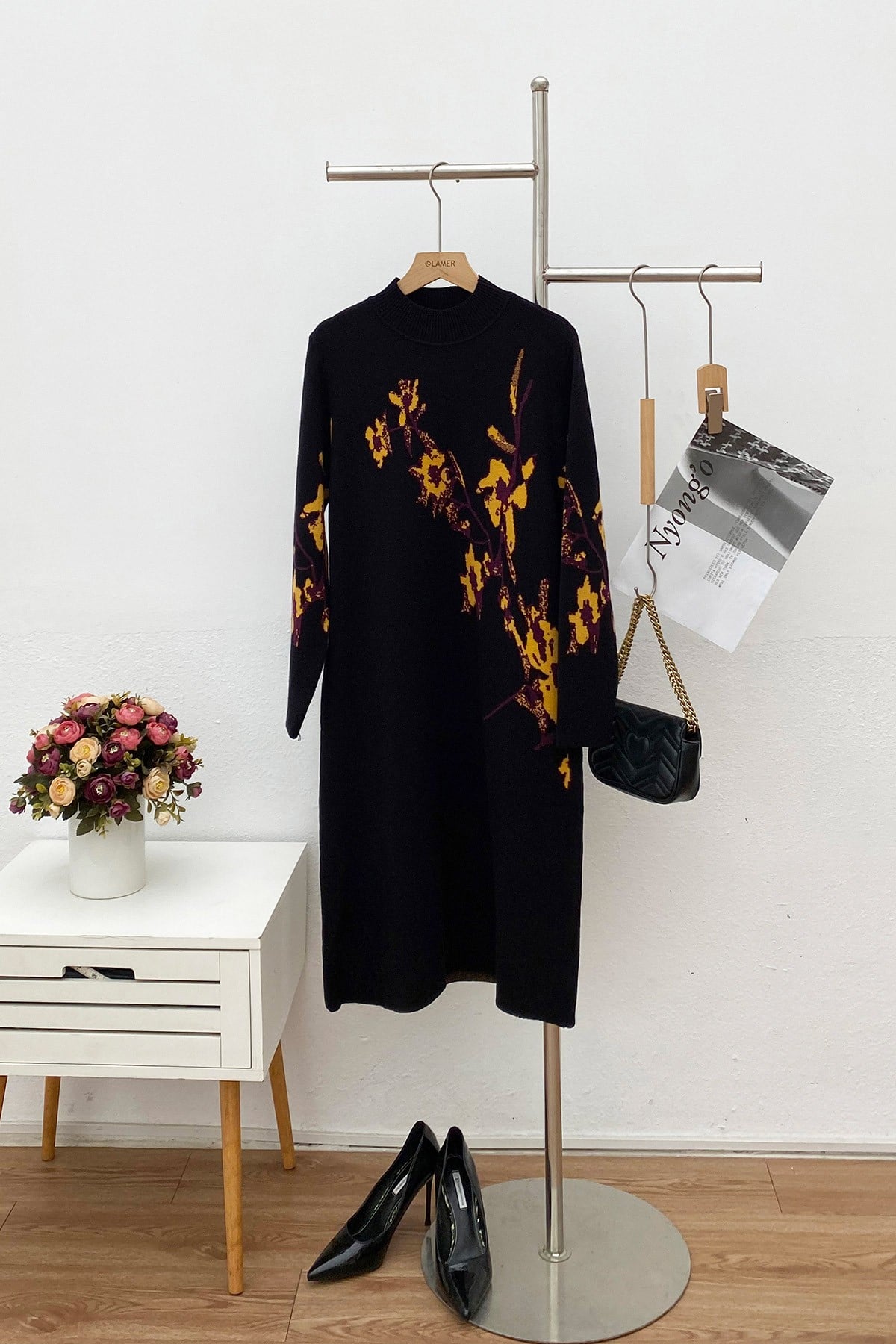 Mô tả sản phẩm : Đầm len dáng suông, tay dài, cổ bo tròn, dệt hoa