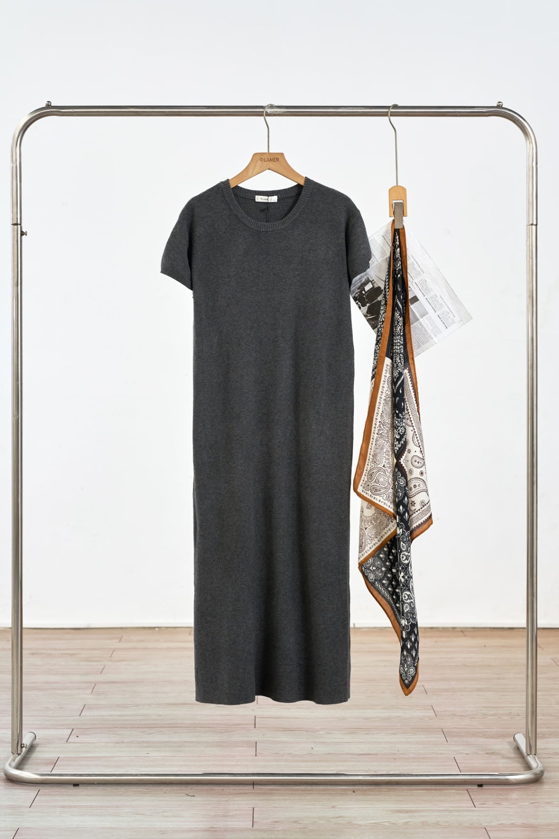 Mô tả sản phẩm : Đầm len dáng suông dài, tay ngắn, cổ tròn kèm khăn hoạ tiết