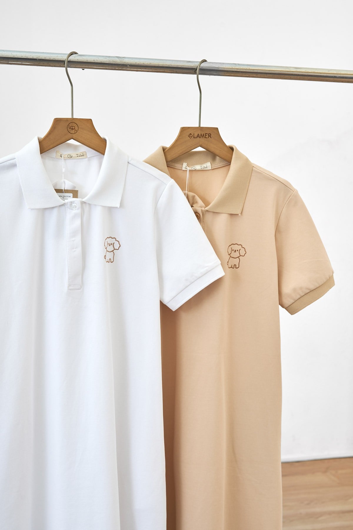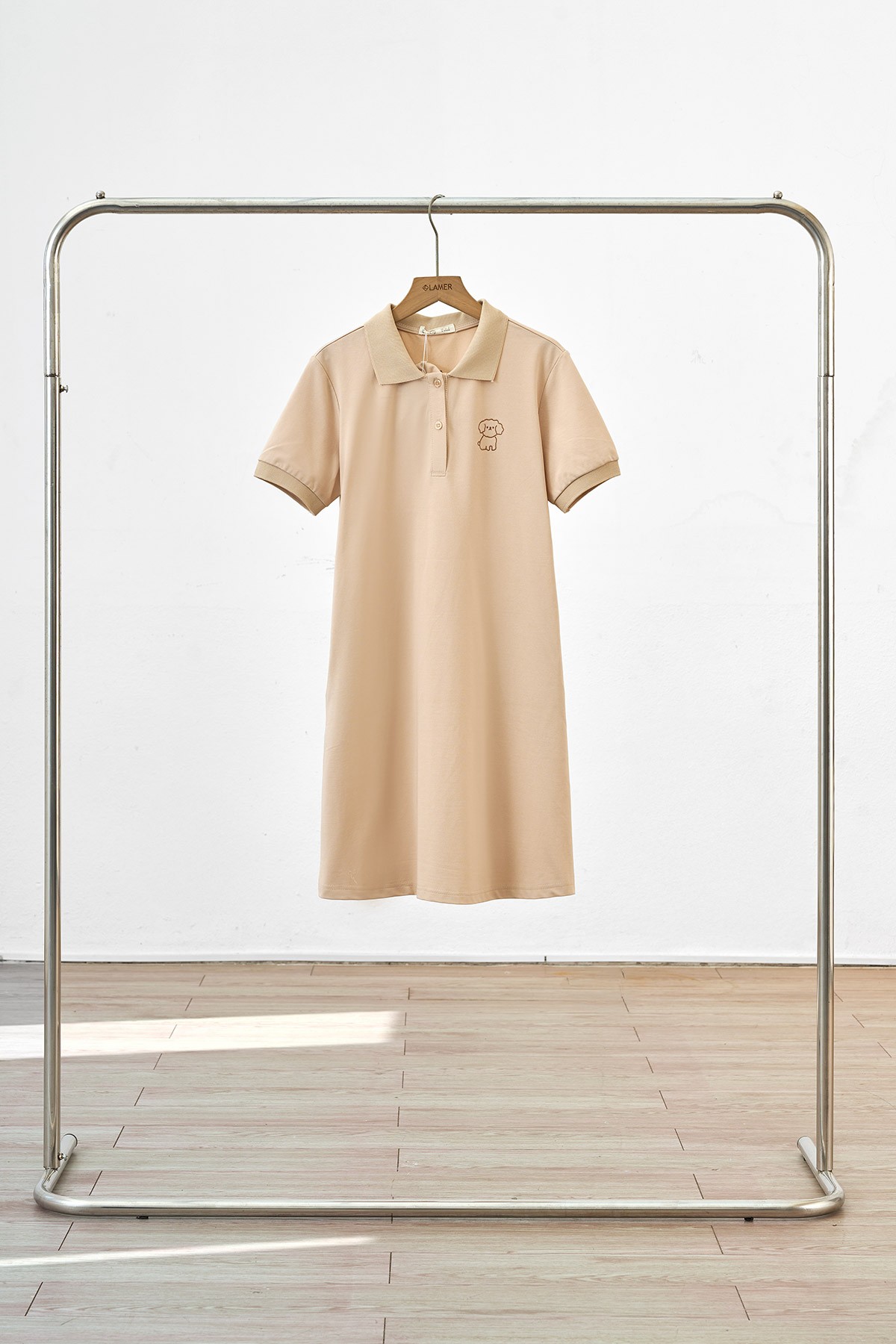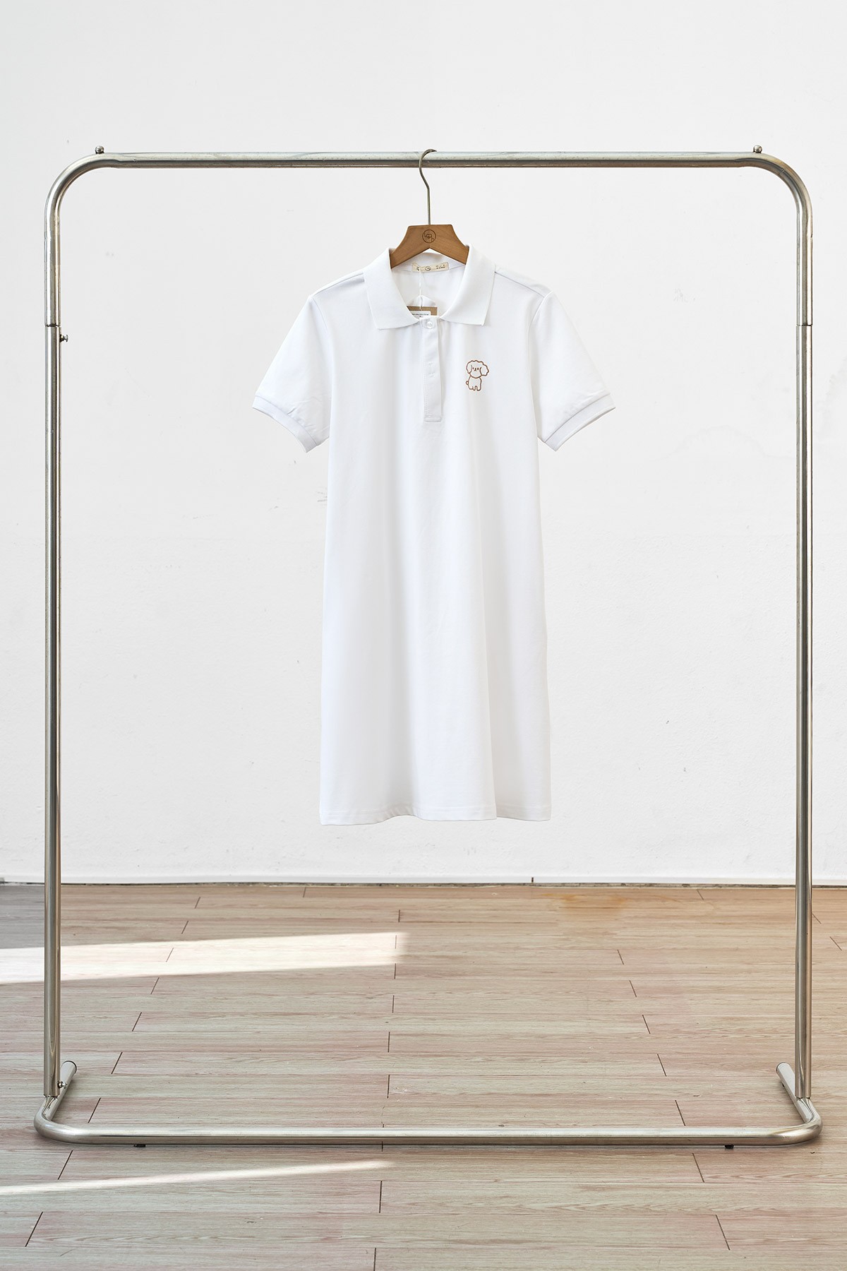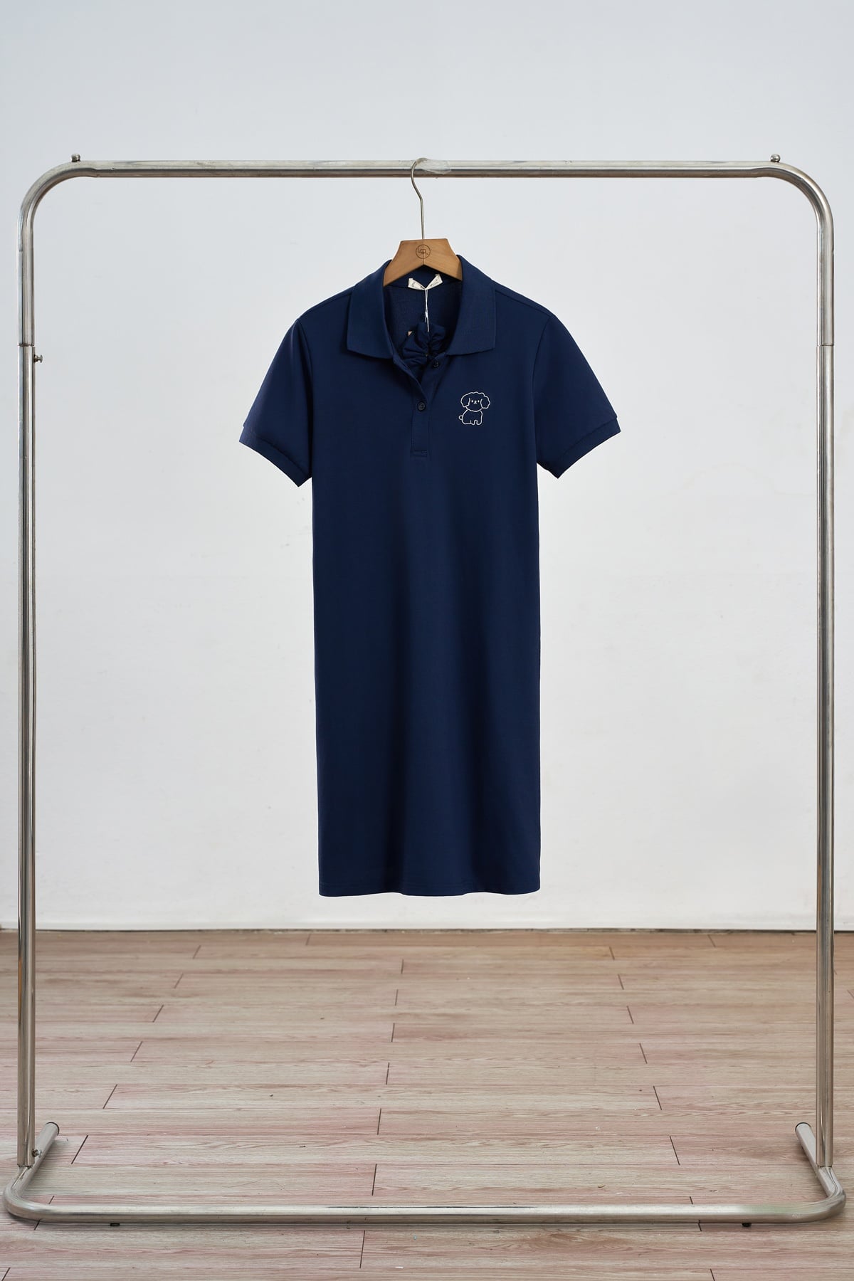 Mô tả sản phẩm : Đầm dáng suông 2 túi dọc, cổ bẻ, nẹp đính cúc, ngực thêu hình.