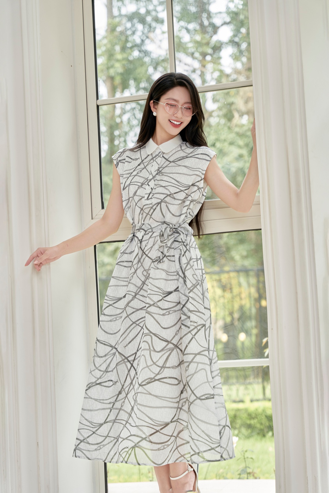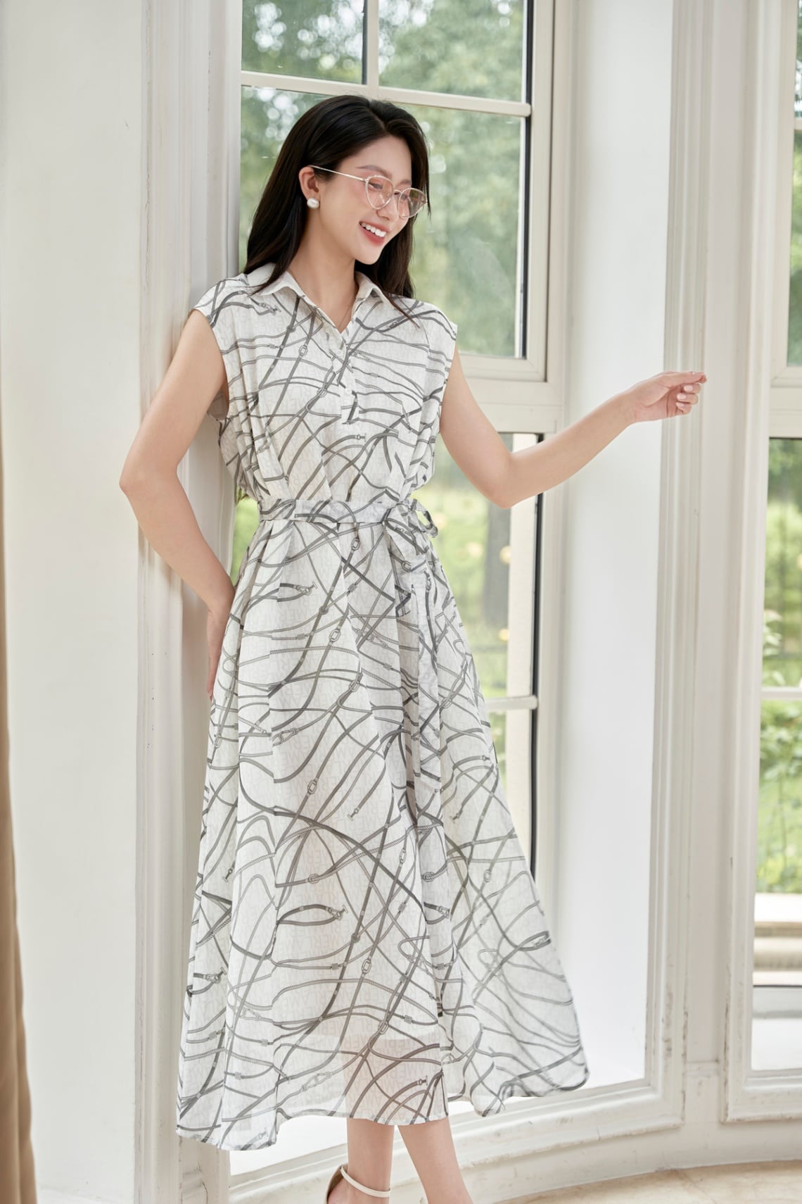Mô tả sản phẩm : Đầm dáng suông, cổ đức phối, nẹp trụ đóng cúc sơ mi, nơ buộc eo.
