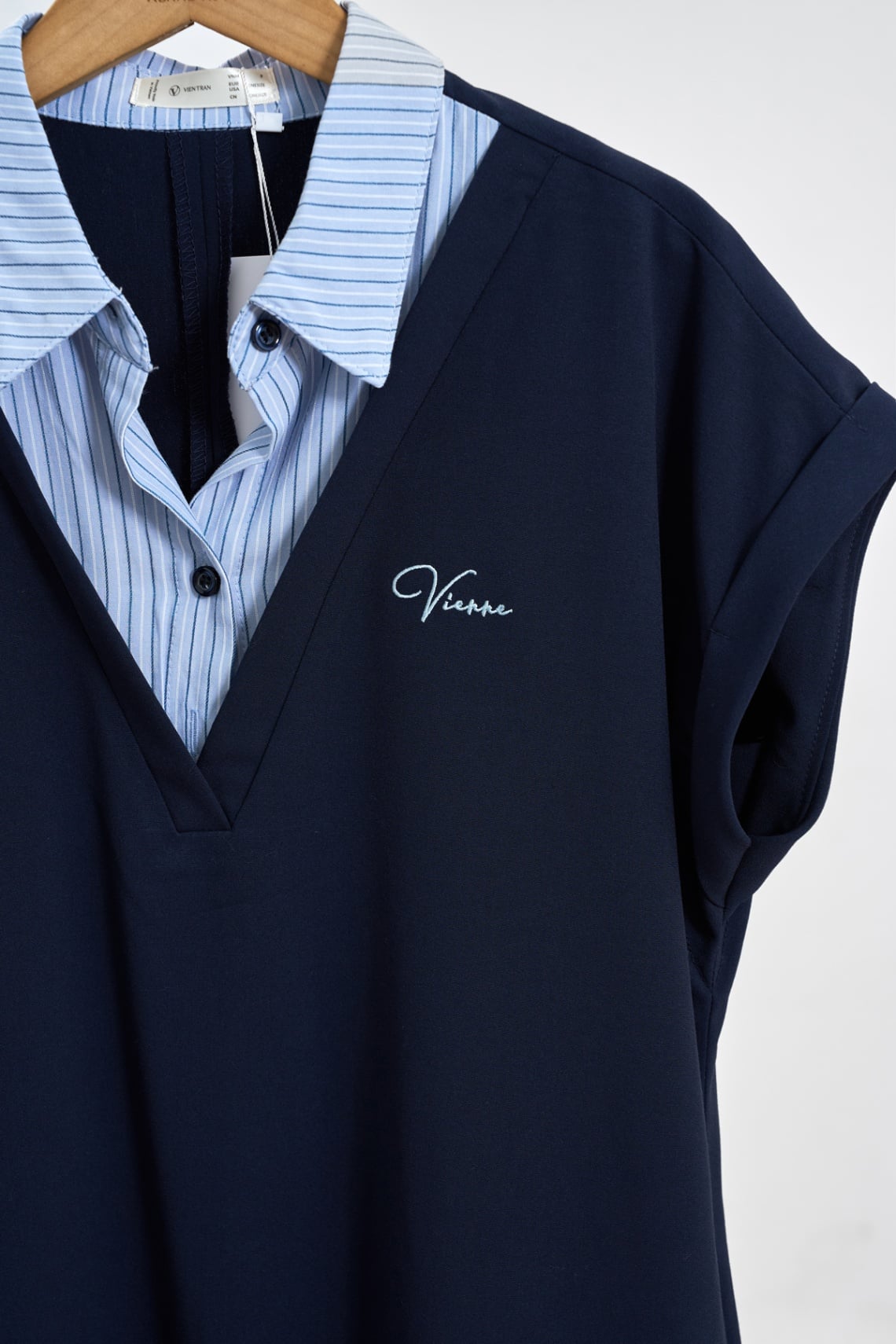 Mô tả sản phẩm : Đầm dáng suông, phối cổ kẻ, tay lơ vê, thêu ngực trái.