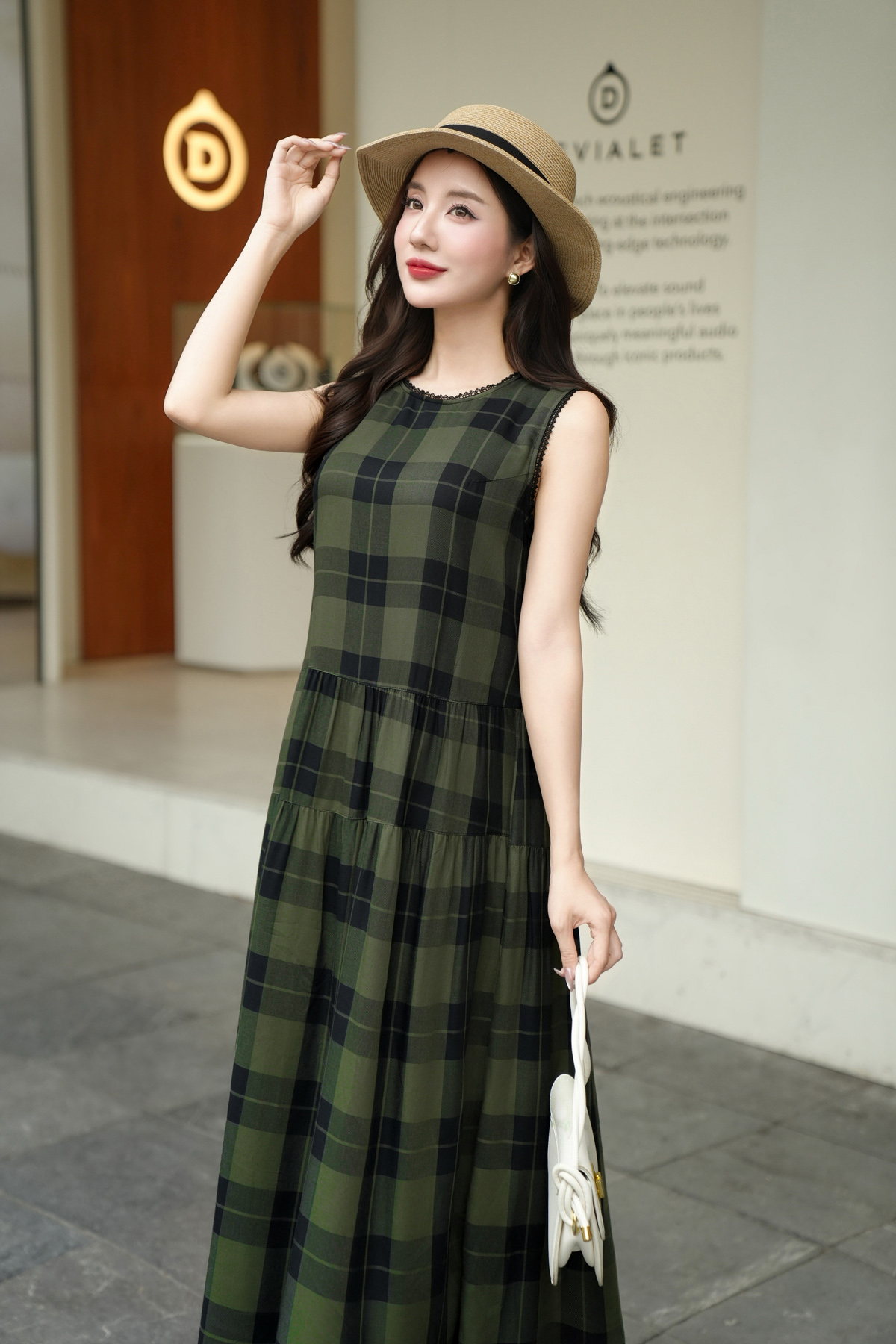 Mô tả sản phẩm : Đầm dài dáng suông, cổ tròn, sát nách, khóa sau, nhún tầng, dây ren.