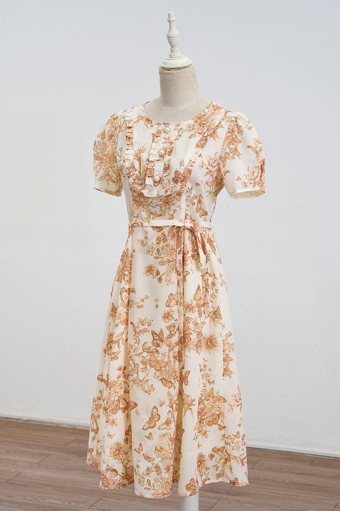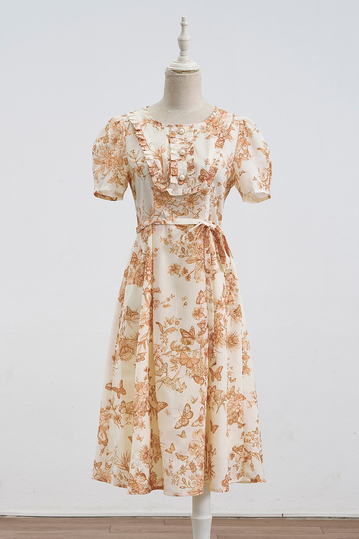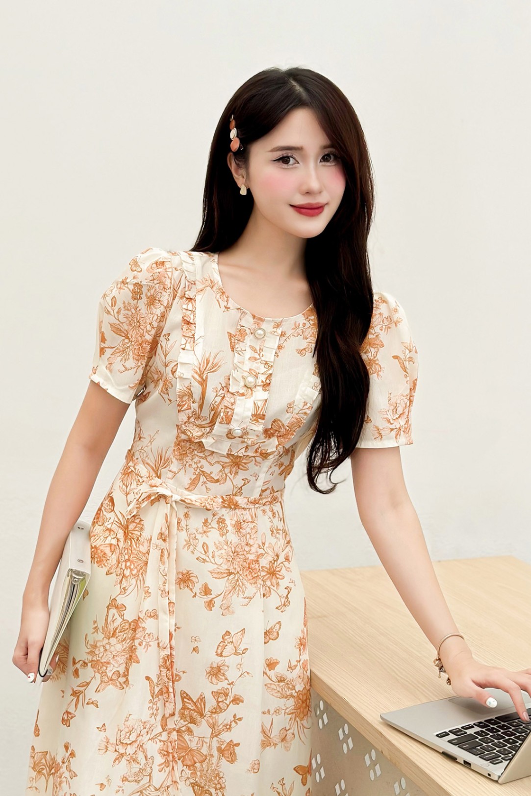 Mô tả sản phẩm : Đầm dáng xòe, cổ tròn, xếp bèo cầu ngực, cúc đính trai trang trí, nơ eo buộc, kéo khóa sau lưng.