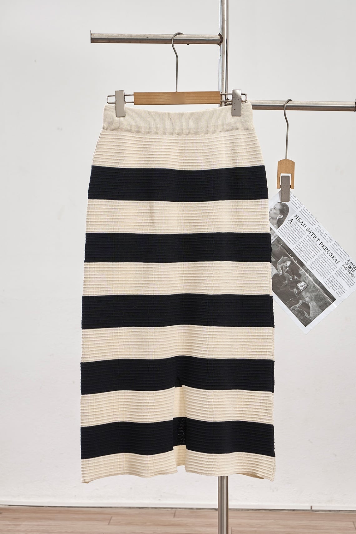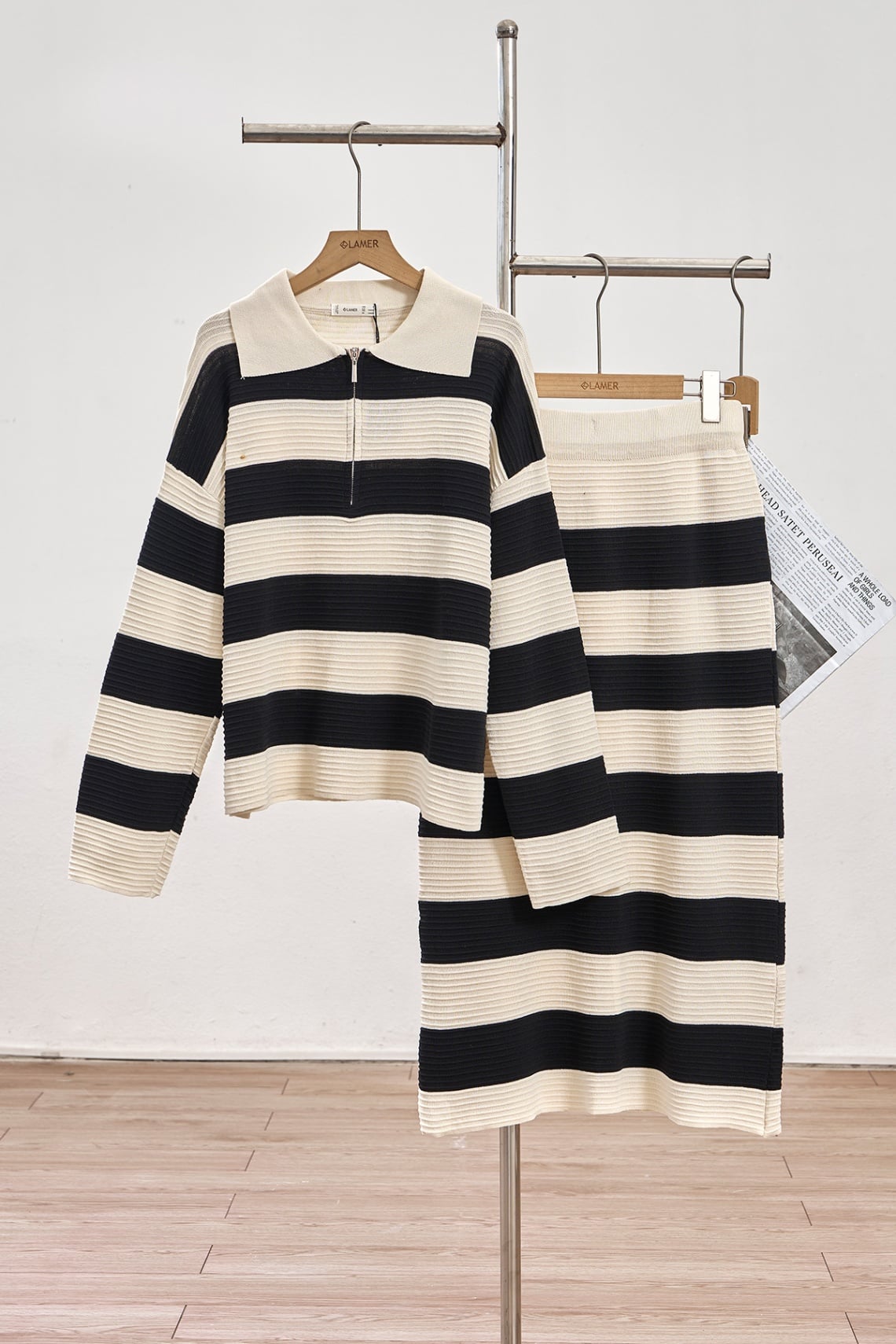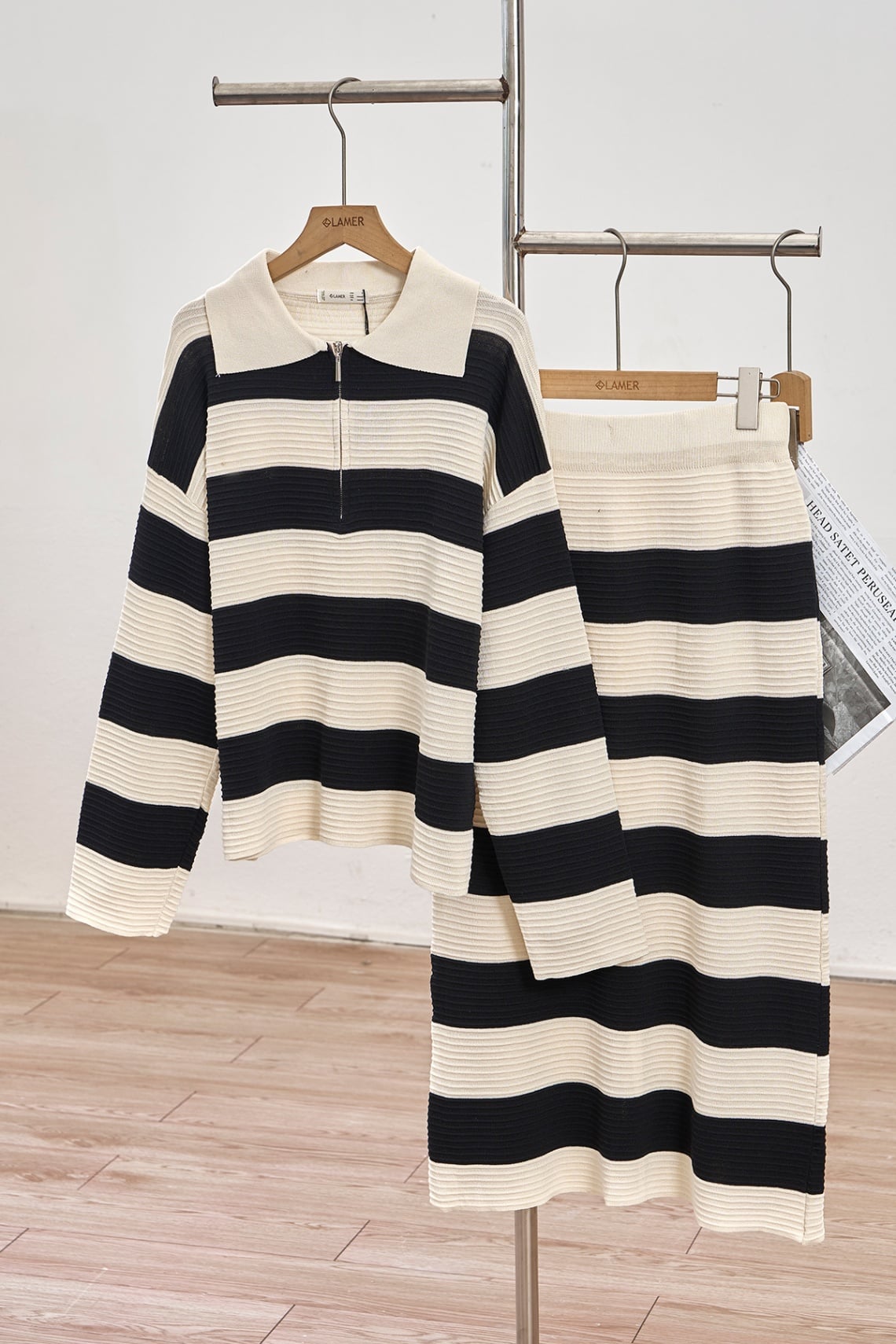 set bộ kẻ áo dài tay cổ bẻ và chân váy dáng dài - N66C24T044
